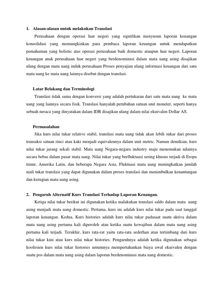 Contoh Soal Kasus Translasi Mata Uang Asing. Selisih kurs akibat translasi dalam mata uang asing harus diperhitungkan dalam penentuan rugi laba periode tertentu. Isu kurs dikombinasikan dengan berbagai methode translasi yang dapat digunakan dan perlakuan "Laba/Rugi" translasi yang.